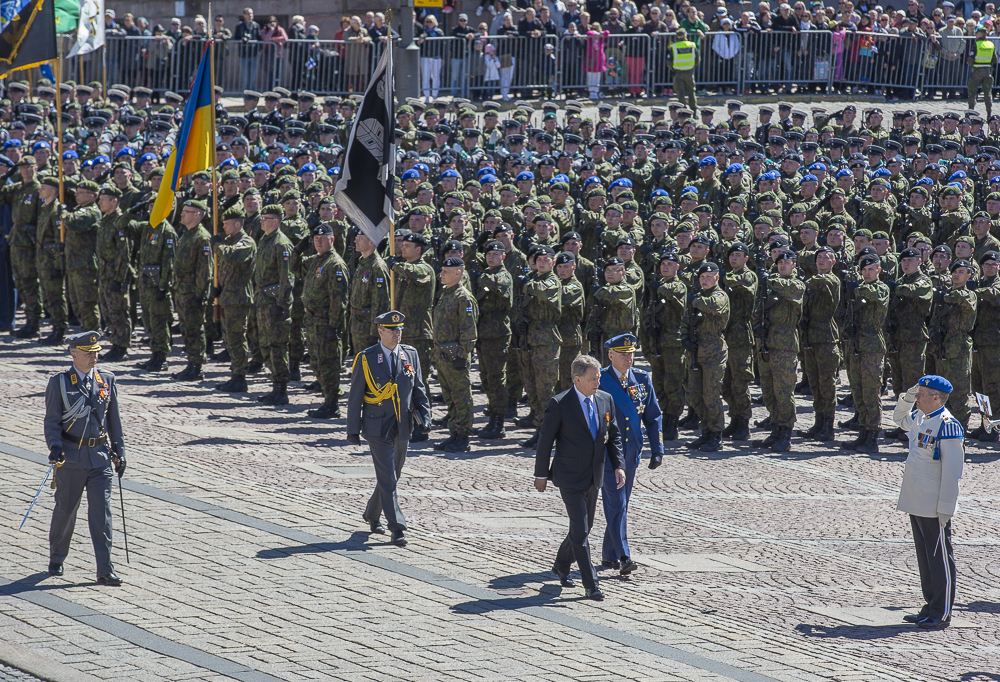 Tasavallan presidentti Sauli Niinistö tarkasti paraatijoukon yhdessä puolustusvoimain komentajan Jarmo Lindbergin kanssa Senaatintorilla.