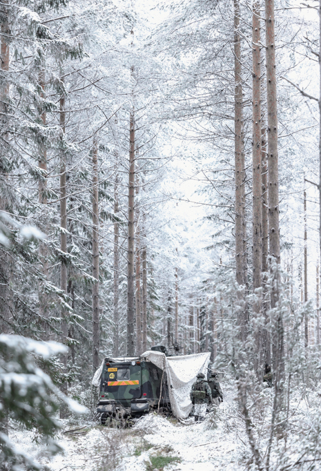 Jääkäri Sami kiskoo naamioverkon ajopelinsä päältä ja hyppää sisään. Telakuorma-auton kyyti on pomppuinen pitkin metsään tehtyä uraa.