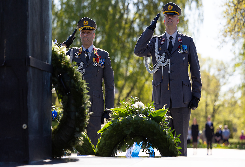 Puolustusvoimain kometaja, kenraali Janne Jaakkola (vas.) teki kunniaa laskettuaan seppeleen Sankariristille. Kuva: Oskar von Essen