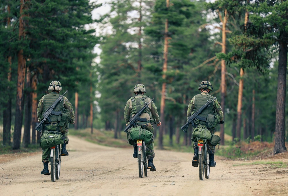 Seuraava ohjelmanumero ajoneuvojen lastaamisen jälkeen oli polkupyörien hakeminen ja niiden saattaminen taistelukuntoon. Varusmiehet kiinnittivät toisen reppunsa pyörien tarakoille ja täyttivät kumit. Alokkaiden onneksi sadekuuro oli tähän mennessä ehtinyt loppumaan ja taisteluvarustus säästyi suuremmalta kosteudelta.