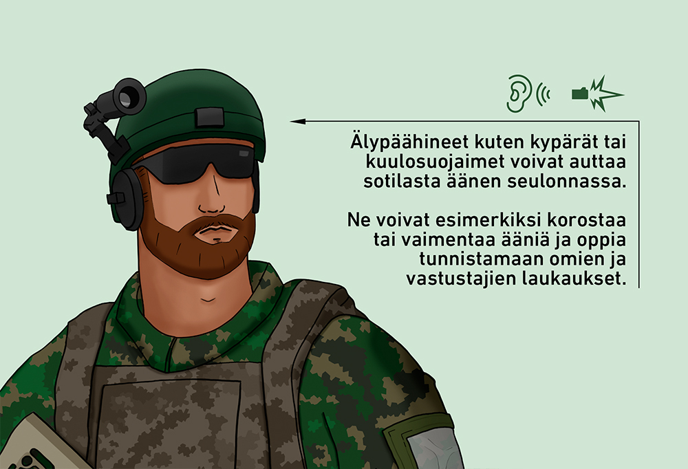 – Erilaiset älypäähineet, kuten kypärät ja kuulosuojaimet voivat auttaa sotilasta äänen seulonnassa. Ne voivat esimerkiksi korostaa tai vaimentaa ääniä ja oppia tunnistamaan omien ja vastustajien laukaukset, jolloin saadaan lisättyä taistelijan tilannetietoisuutta, Kosola selventää.