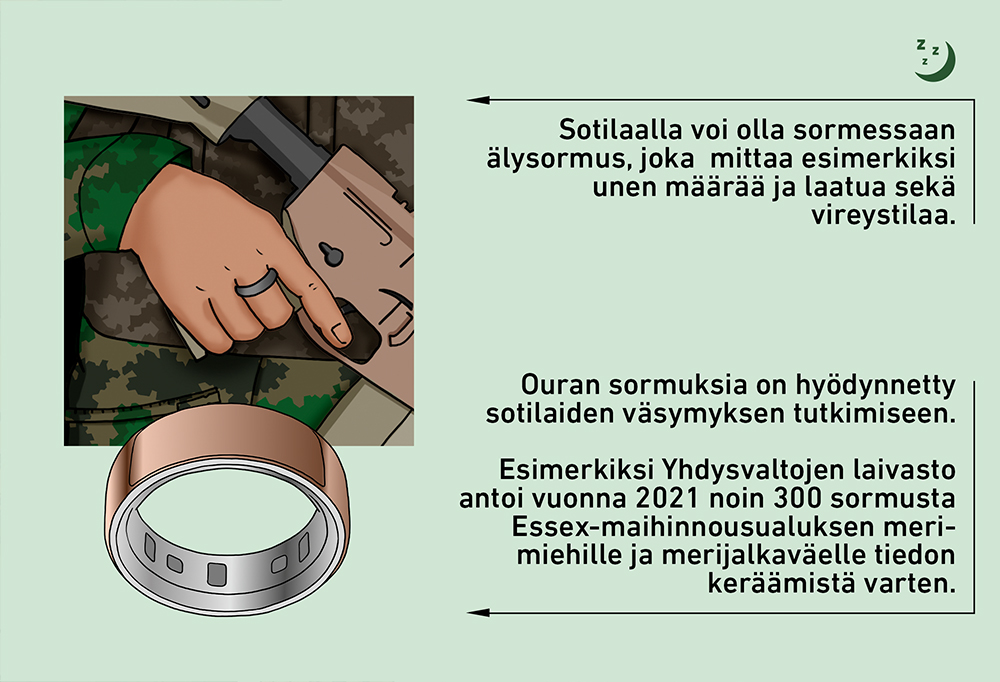 Viime vuoden lopussa uutisoitiin, että Yhdysvaltain puolustusministeriö tilasi 87 miljoonan euron arvosta älysormuksia suomalaiselta terveysteknologiayhtiö Ouralta. Myöhemmin Yhdysvallat perui tilauksen, mutta kiinnostus kertoo, kuinka tärkeää on saada reaaliaikaista tietoa sotilaiden toimintakyvystä ja terveydestä.