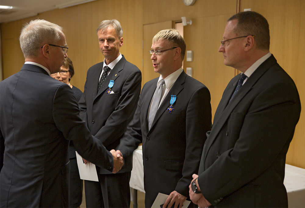 Neljälle henkilölle luovutettiin tänään 26. toukokuuta Suomen Rauhanturvaajaliiton (SRTL) 1. luokan ansioristit puolustusministeriössä. Ansioristit myönnettiin ansiokkaasta työstä kansallisen kriisinhallinnan veteraaniohjelman kehittämisessä ja toimeenpanossa. Historian saatossa kriisinhallintatehtävissä on palvellut noin 45 000 suomalaista.