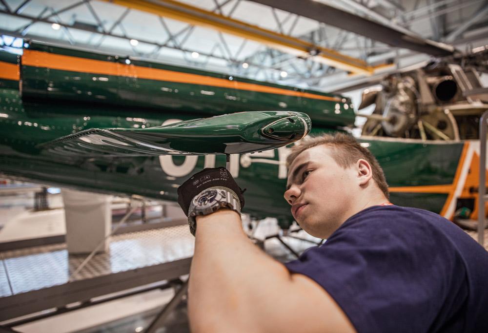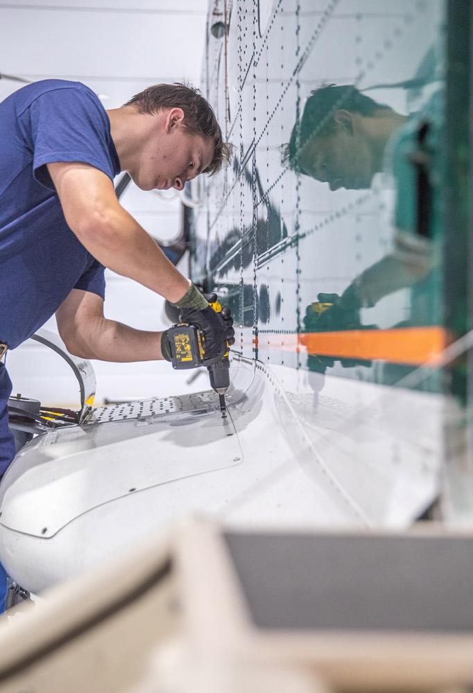 Alikersantti Miro Tammi korjaamassa DO-228 Dornier -valvontakonetta, joiden elinkaari Rajavartiolaitoksella on pian päättymässä.