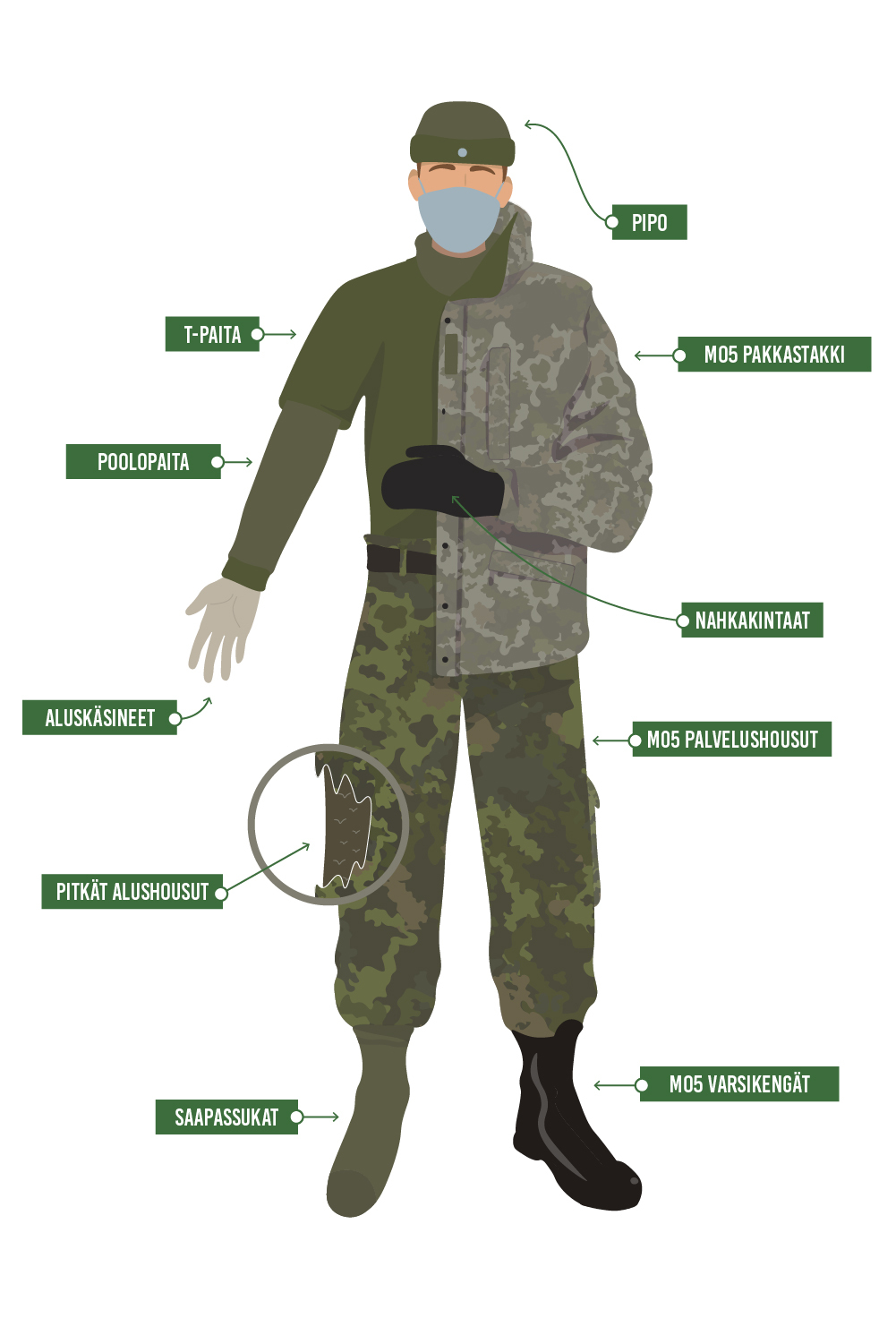 Palveluksessa varusmies viettää suuren osan ajastaan ulkoilmassa ja erityisesti tammikuussa palvelukseen saapuville on tärkeää osata pukeutua kunnolla talvipakkasten kylmyyteen. Pakkassäillä on haitallista olla liikaa tai liian vähän vaatteita, tai vaatteita väärässä järjestyksessä päällä.