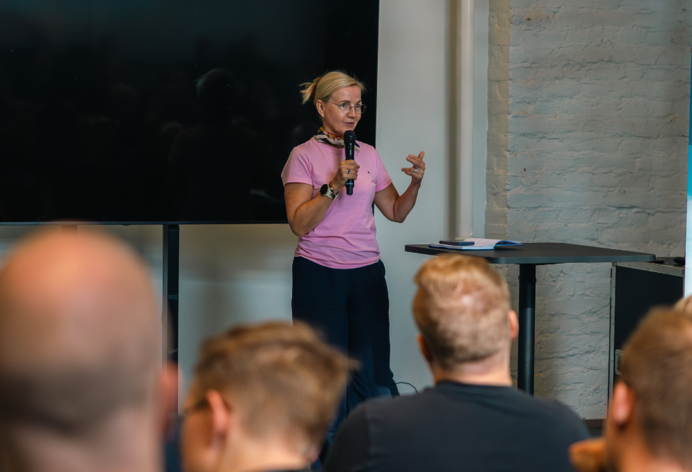 Paneeliin kuulunut majuri (res) Tiina Laisi-Puheloinen Fibanista julkisti voittajan. Hän on erityisen tyytyväinen pitchaajien hyvään kuvaukseen ratkaistuista ongelmista. Kuva: Remu Shemeikka