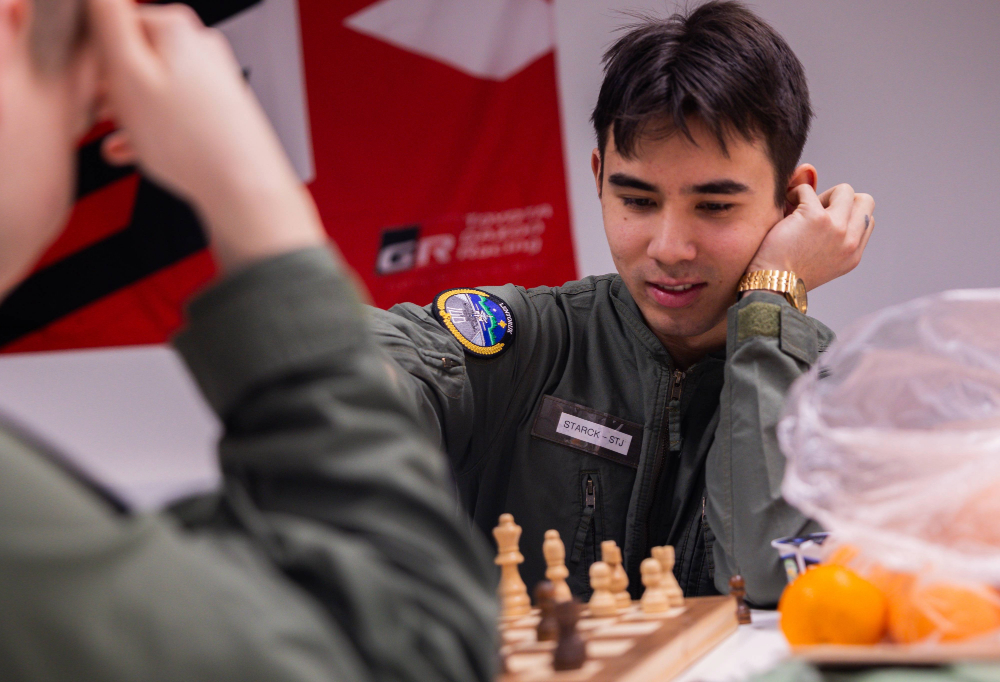 Upseerioppilas Joel Rajala haastoi odotellessa Jalmari Starckin shakkiotteluun, jonka hän lopulta voitti. Kuva: Remu Shemeikka