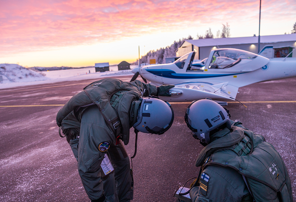 Rajala ja Starck lähtevät kohti plattaa, missä heitä odottavat valmiiksi riviin hinatut Grob G 115 -koneet. Harjoittelukäyttöön suunnitelluissa kaksipaikkaisessa potkurikoneessa on tilaa oppilaalle ja lennonopettajalle, joka tarkkailee tilannetta ja ottaa tarvittaessa ohjat.