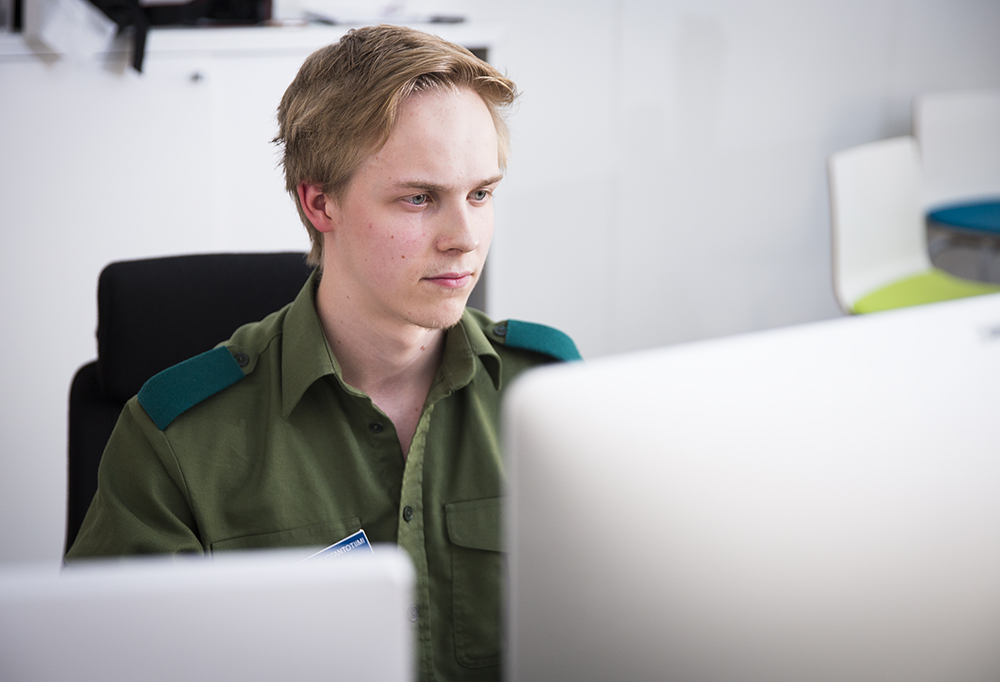 Kaartinjääkäri Jaro Koho Espoosta palvelee Pääesikunnassa graafikkona. Kiinnostus alaa kohtaan sai Kohon hakemaan erityistehtävään. Koho pitää tärkeänä tehtävässä saamaansa kokemusta graafikon työstä ja eri ohjelmista, jotka ovat tulleet tutuksi editoitaessa sekä bannereita ja tiedotteita laatiessa.