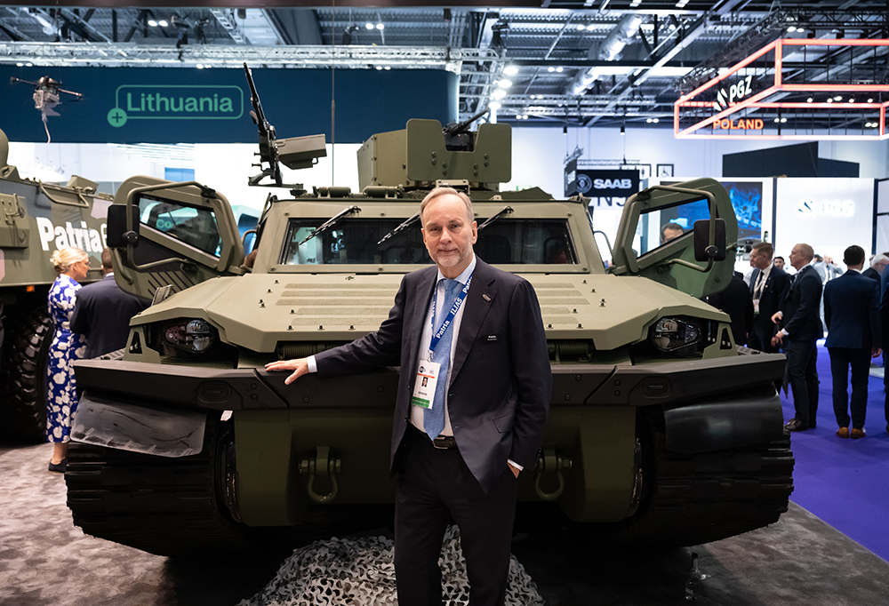 Esa Rautalinko poseeraa vastapaljastetun Patria TRACKX-tela-ajoneuvon edessä DSEI-messuilla Lontoossa syyskuussa 2025. Kuva: Patria