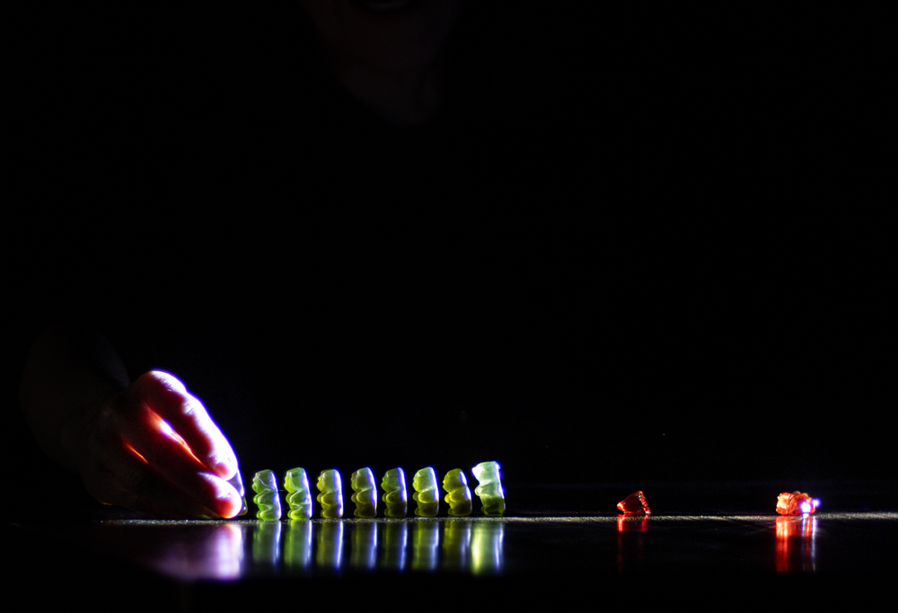 – Haluamme, että esityksemme ovat intiimejä kokemuksia, koska siten herätämme katsojien ajatukset parhaiten. Myös käytännön kannalta katsojat eivät voi istua liian kaukana, koska lavalla tosiaan on ne pienet nallekarkit. Siksi meillä on yhdessä esityksessä katsomassa yleensä vain noin 20–35 ihmistä, Trofa kertoo