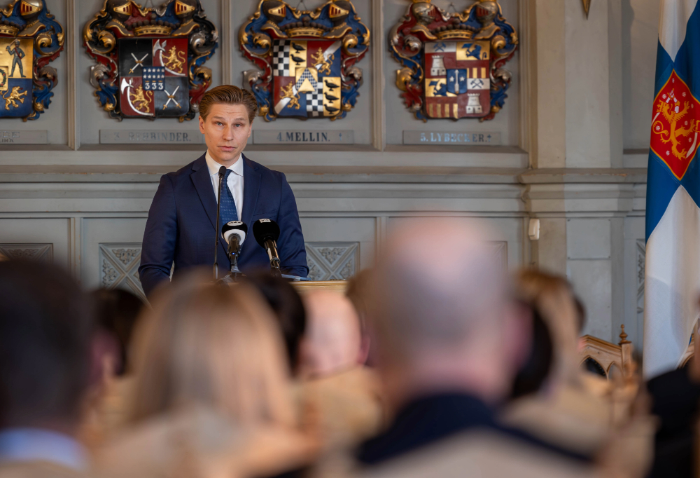 Puolustusministeri Antti Häkkänen avasi 250. valtakunnallisen maanpuolustuskurssin Ritarihuoneella 4. marraskuuta. Kuva: Patrik Vuori