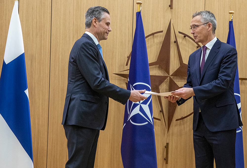 Klaus Korhonen sai historiallisen kunnian luovuttaa Suomen jäsenhakemuksen Naton pääsihteeri Jens Stoltenbergille. Kuva: Juha Roininen