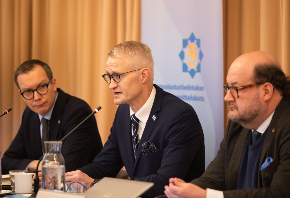 MTS:n kyselyn mukaan suomalaiset suhtautuvat maanpuolustukseen luottavaisin mielin, vaikka kokevatkin turvallisuuspoliittisen tilanteen epävarmaksi. Kuvassa MTS:n tutkimusjaoston puheenjohtaja Riku Keski-Rauska, MTS:n puheenjohtaja Jarno Limnéll sekä MTS:n sihteeri Markus Kinkku. Kuva: Amos Kautto