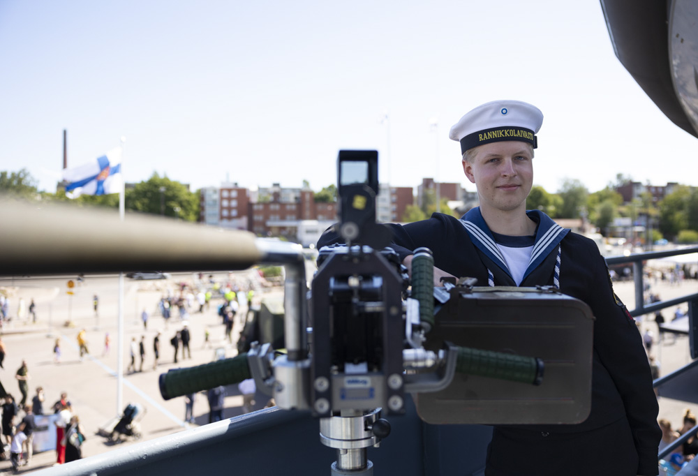 Alikersantti Aapo Kivivuori pääsi esittelemään palveluspaikkaansa miinalaiva Hämeenmaata Kotkan Kantasatamaan saapuneelle juhlakansalle. Tarkemmassa esittelyssä oli laivakonekivääri. Kuva: Oskar von Essen
