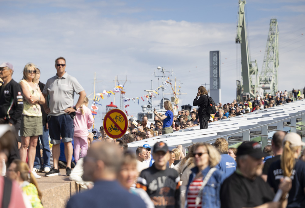 Merikeskus Vellamon kattoterassi täyttyi paraatikatselmusta seuraamaan tulleesta yleisöstä. Myöhemmin päivällä yleisöllä on mahdollisuus tutustua Merivoimien kalustoon ja käydä meriajeluilla Utö- ja Jurmo-luokan aluksilla. Kuva: Oskar von Essen