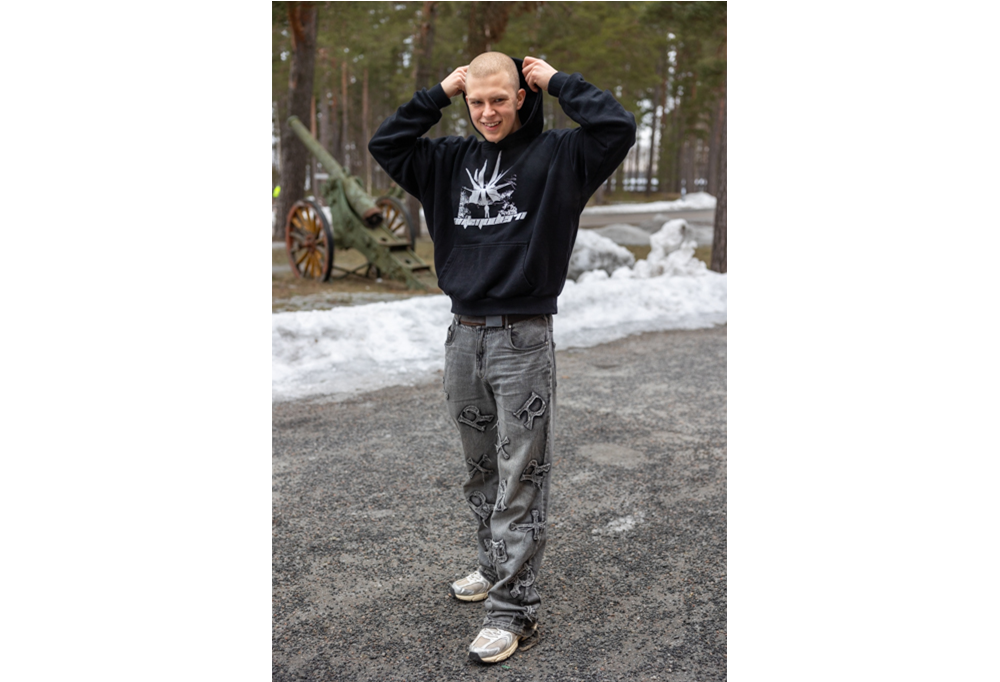 Onni Isohella, Helsinki, pukeutui kotiutuspäivänä itse suunnittelemaansa huppariin.