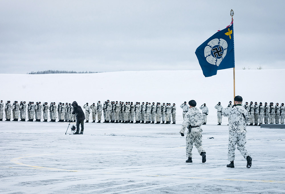 Valkoisella kentällä kylmä tuuli kuritti alokkaita heidän seistessään patsaiden kaltaisina. Edestä alokkaita katselivat paraatikatselmuksen suorittanut Ilmasotakoulun johtaja, eversti Henrik Elo, everstiluutnantti Tanttu, kenttähartauden pitänyt sotilaspastori Marko Haukkamäki sekä sotilasvalan esilukijana toiminut kansanedustaja Joonas Könttä.