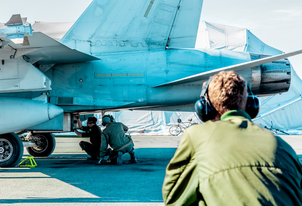 Lentokentän asvaltilla seisoskelevat varusmiehet kersantti Joel Kuosmanen ja alikersantti Oskar Ormio. He ovat kummatkin apumekaanikkoja. Tervehdimme ja katselemme yhdessä, kun Hornetit lähtevät päivän ensimmäiselle tehtävälleen.