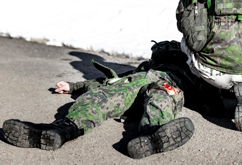 Maassa makaa kuusi varusmiestä taistelupelastajien hoidettavana. Jokaiselta löytyy erilaisia harjoitusmielessä simuloituja haavoja, joillakin on ampumahaavaa polvessaan, toisen naama on ihan verillään.