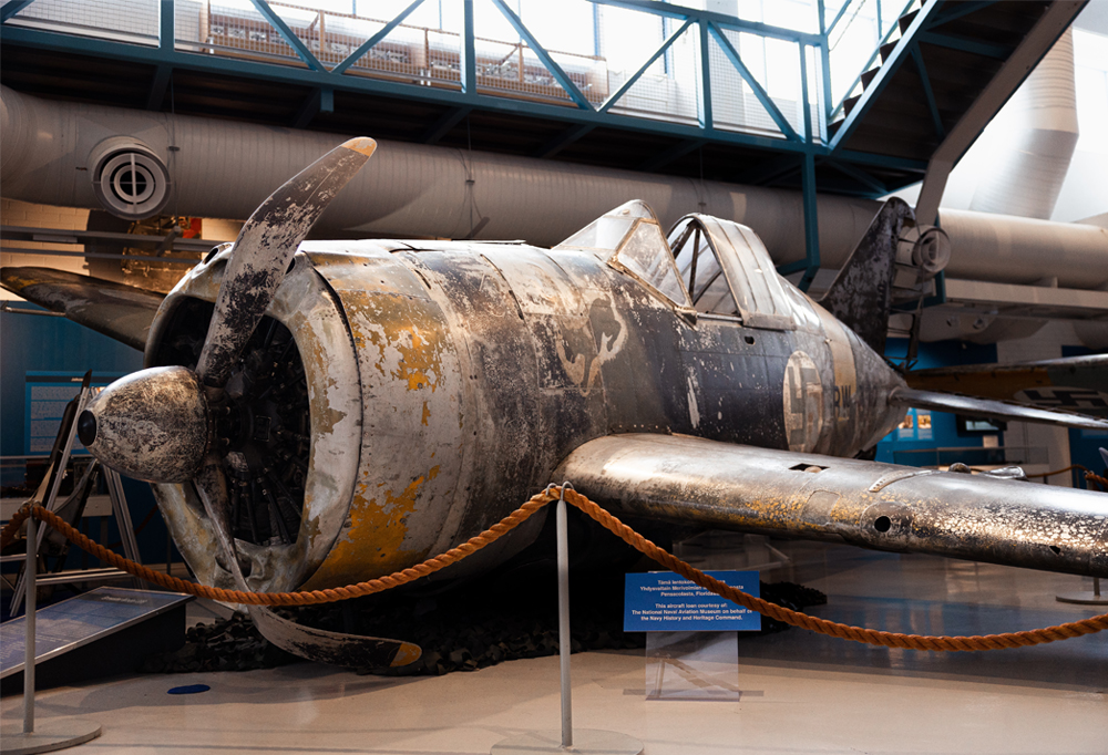 Ilmavoimamuseossa on nähtävillä maailman ainoa säilynyt Brewster. Se pelastettiin järven pohjasta jälkipolville. Kuva: Onni Isohella