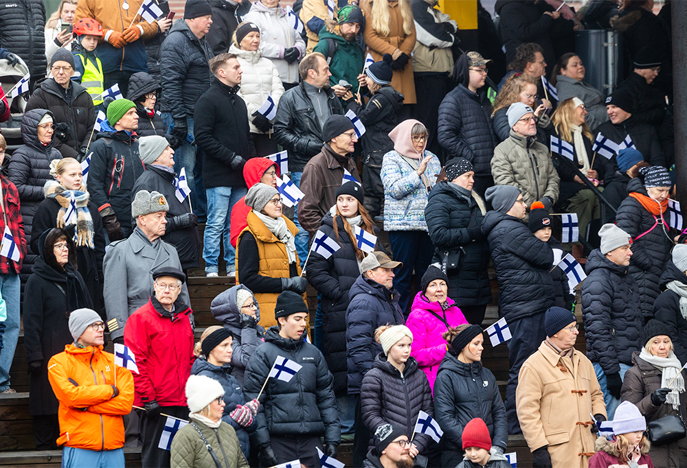 Kouvolan keskustan läpi kulkeneen paraatireitin reunoille oli kertynyt runsaasti yleisöä. Suomen liput liehuivat katsojien joukossa.