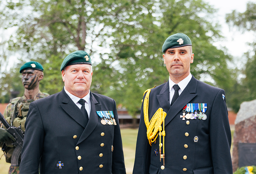 Harri Koponen (vasemmalla) ja komentaja Atte Löytönen ovat merkittäviä henkilöitä rannikkojääkärien perinnetyössä. Kuva: Olli Nurminen