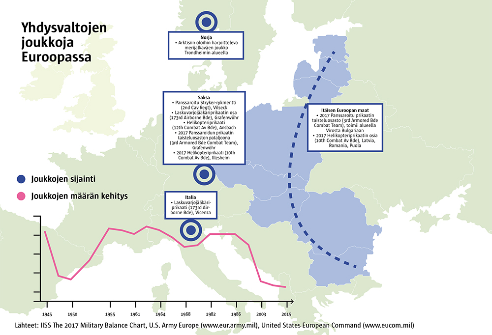 Kylmän sodan huippuvuosina Yhdysvalloilla oli Euroopassa yli 400 000 sotilasta. Neuvostoliiton ja Varsovan liiton romahdettua sekä Saksan yhdistyttyä joukkojen määrä laski aina Ukrainan kriisiin saakka. Nyt amerikkalaisten tankit ovat palanneet Euroopan maaperälle, mutta joukkojen määrä on vielä alle 70 000 sotilaan.