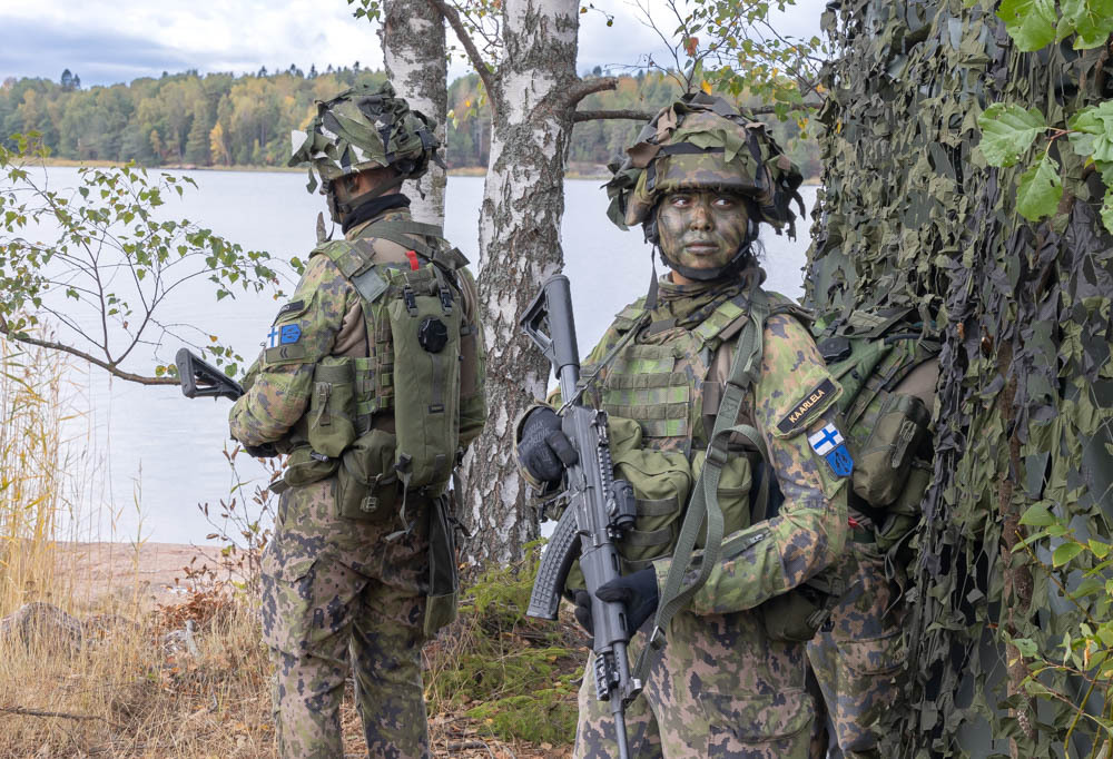 Valmiusyksikön taistelijat suorittavat tehtävää naamioidun teltan ympäristössä. Kuva: Tuomas Härmä