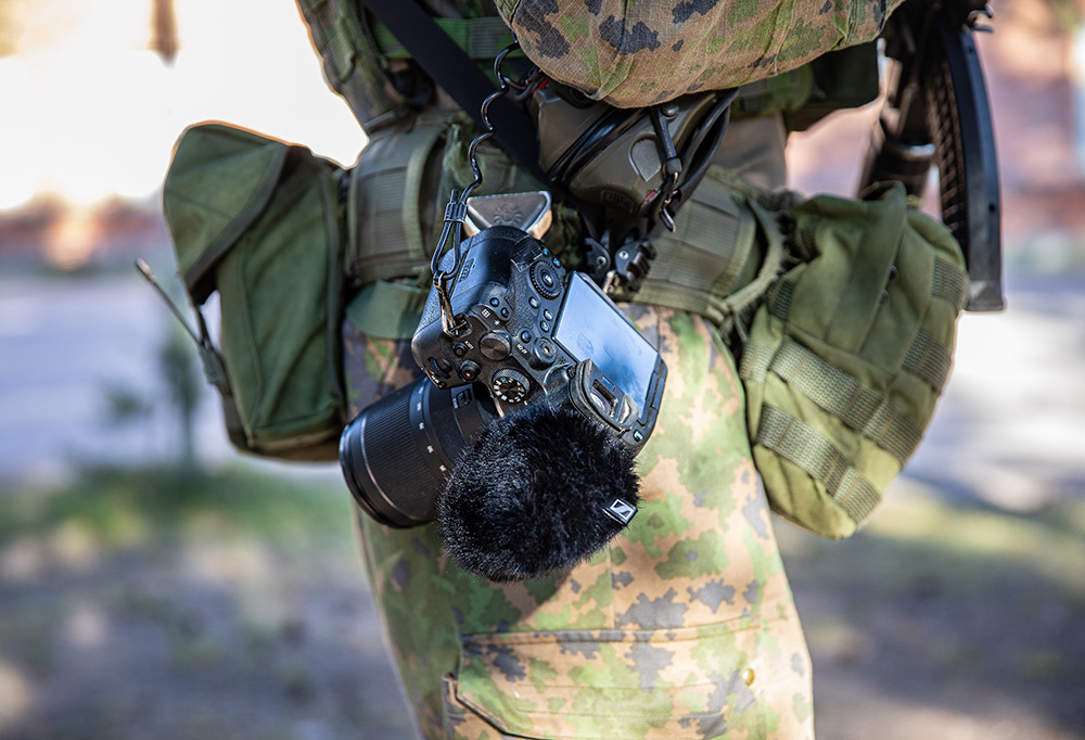 – Itse olen sijoittanut tuon kiinnikkeen, että se on aika tuolla takana. Näin tämän kanssa voi syöksyä turvallisesti, jos kamera roikkuu sivussa se voi helpommin iskeytyä maahan. Alussa me kokeiltiin erilaisia asetteluja ja koettiin tämä toimivaksi, taistelukuvaaja, kaartinjääkäri Max Syrjälä hahmottelee.