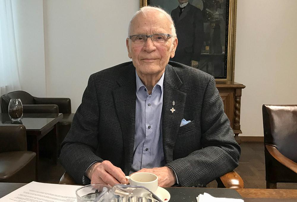 96-vuotias veteraani Risto Kiiskilä toi juhlaan tervehdyksen veteraanisukupolvelta.