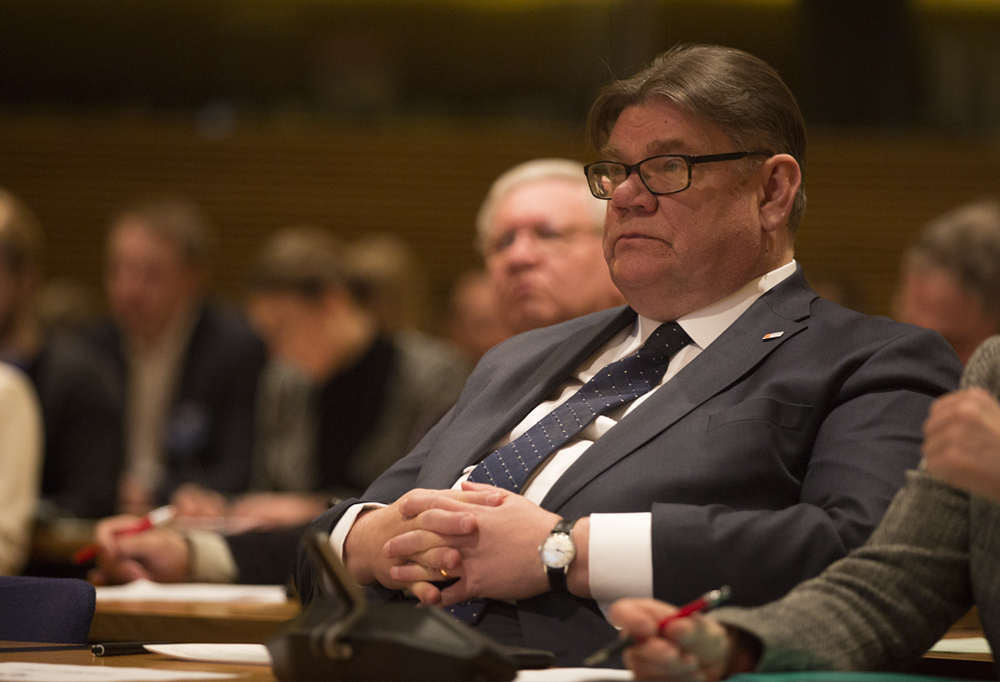 Ulkoministeri Timo Soini seurasi Jyrki Kataisen puheenvuoroa.