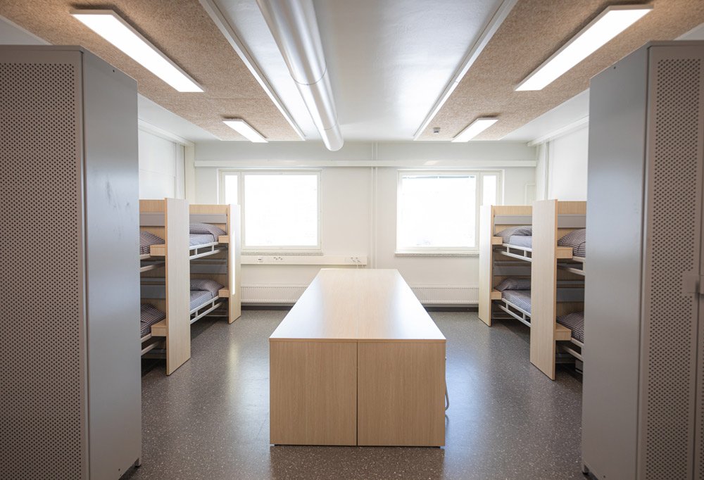 Uusissa 12 henkilön tuvissa punkat ovat tutuilla paikoillaan. Vasemmalla uudistettu kaappi.