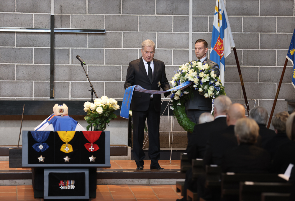 Tasavallan presidentti Sauli Niinistö laski arkulle siunaustilaisuudessa valkoisin ja sinisin kukin koristellun muistoseppeleen.