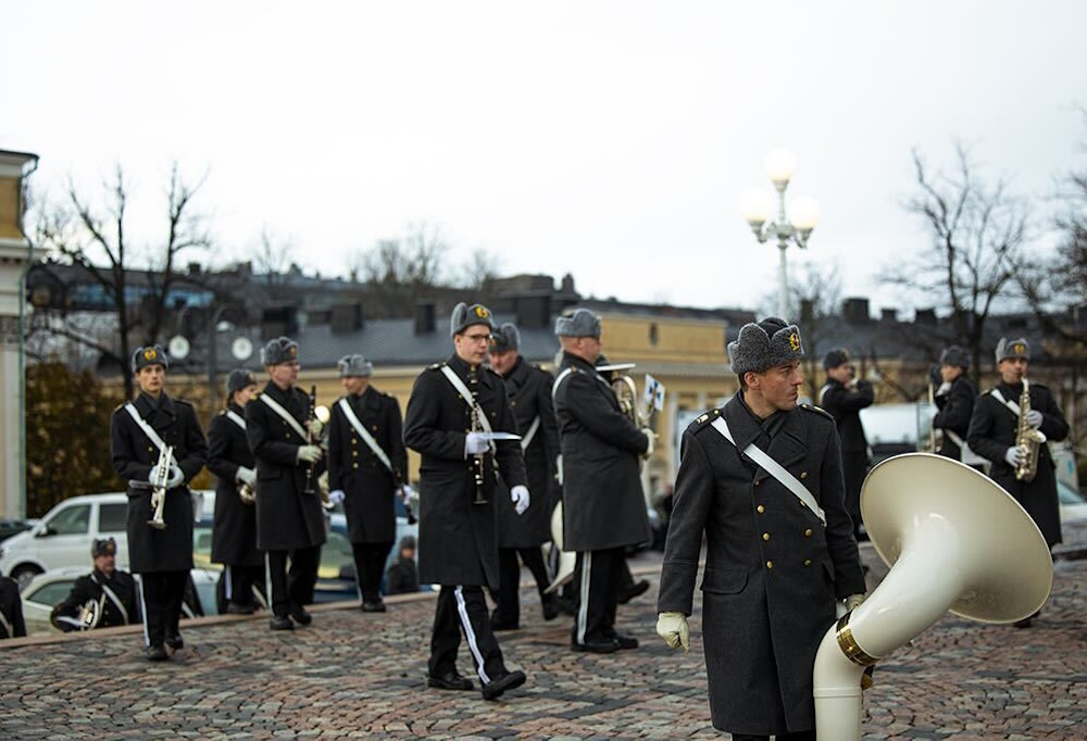 Tuomiokirkon edustalla kapteeni Jukka Saarelan johtama varusmiehistä koostuva Kaartin kunniakomppania ja musiikkieverstiluutnantti Pasi-Heikki Mikkolan johtama Kaartin soittokunta vastaavat kunnianosoituksista. Paikalla oleva lippuvartio koostuu Pääesikunnan sotilaista eri henkilöstöryhmistä.