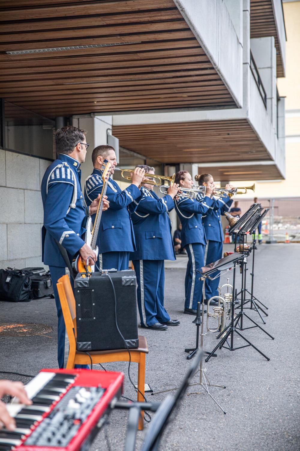Ilmavoimien soittokunta esitti tiiviin lounaskonsertin Kaartinkorttelin henkilöstölle. Kuva: Santeri Väänänen