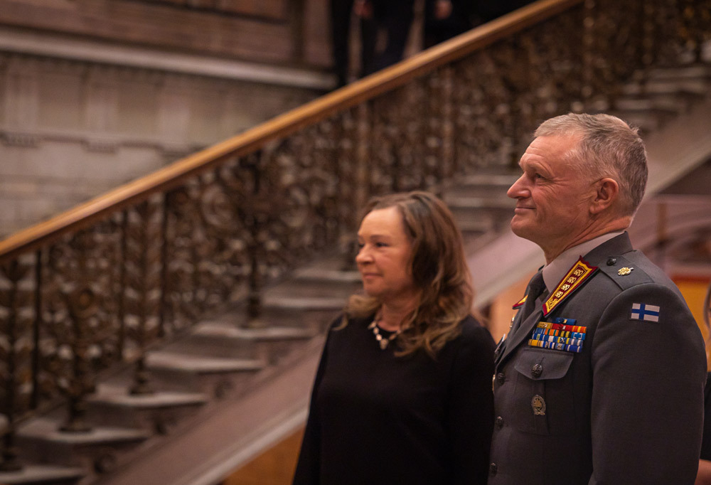 Kenraali Kivinen vaimonsa Maarit Kivisen kanssa puolustusministerin uuden vuoden vastaanotolla. Kuva: Tuomas Härmä
