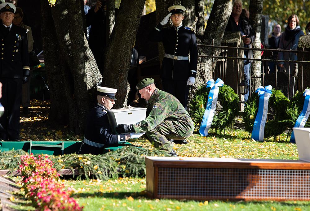 Narvan marssin soidessa lähestyy juhlallisen hitaasti Suomen lipun johtama hautajaissaattue. Se etenee kenttäpiispan johtamana kohti kahden kadetin vartioimaa hautapaikkaa. Lehdet leijailevat tuulen mukana maahan ja varhaisen lokakuun aurinko luo valoaan arvokkaaseen tilaisuuteen.