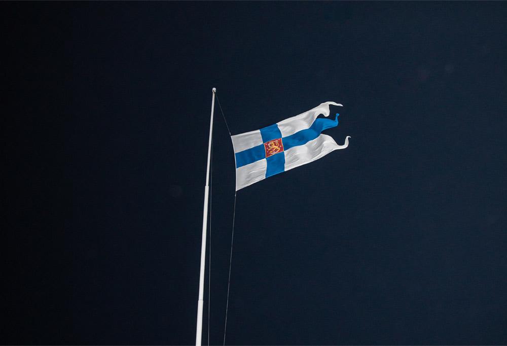 Merisotakoulun upseerioppilaat nostivat kielekkeisen valtiolipun tangonhuippuun Kustaanmiekassa.