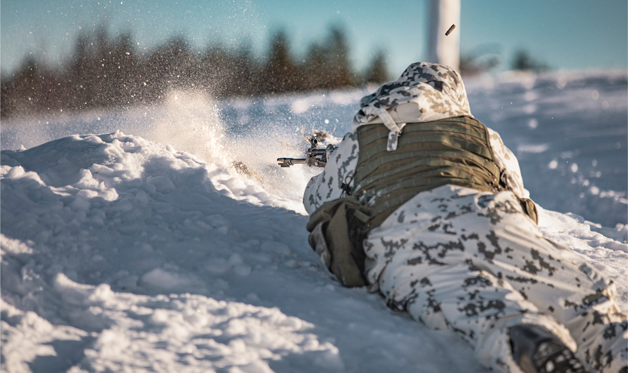 Huoltokomppanian jääkäreille pidetyt hyökkäysammunnat sujuvat mallikkaasti. Koulutus 2020 -ohjelma ei näy maalitauluista, lumihangesta tai auringonpaisteesta.