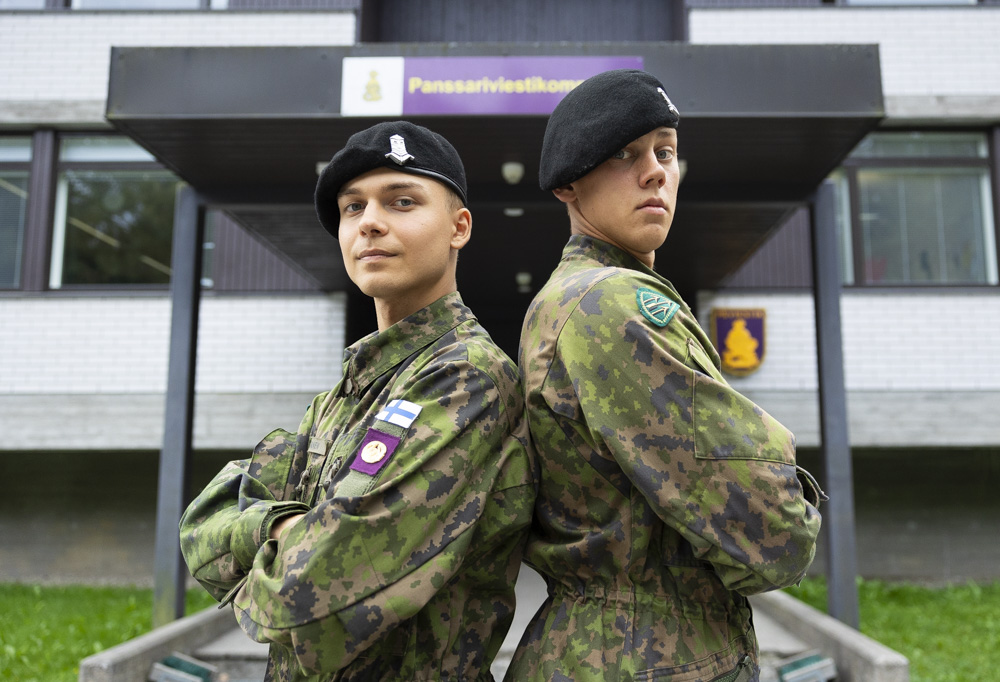 Sotamiehet Atte Rantanen (vas.) ja Sami Saarikko kertovat saaneensa valaa edeltävänä päivänä iloisen uutisen aliupseerikurssille pääsystä. Kuva: Oskar von Essen