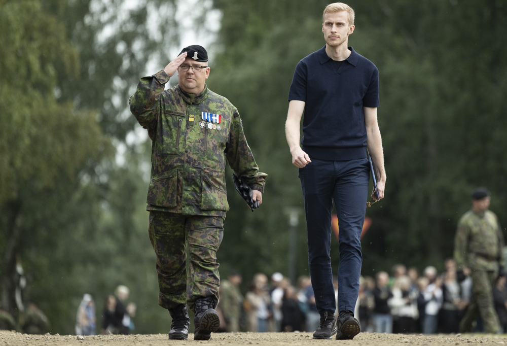 Valan esilukijana toiminut tubettaja Roni Bäck marssi kenttähartauden toimittaneen sotilaspastori Pasi Hakkaraisen kanssa yleisön eteen. Kuva: Oskar von Essen