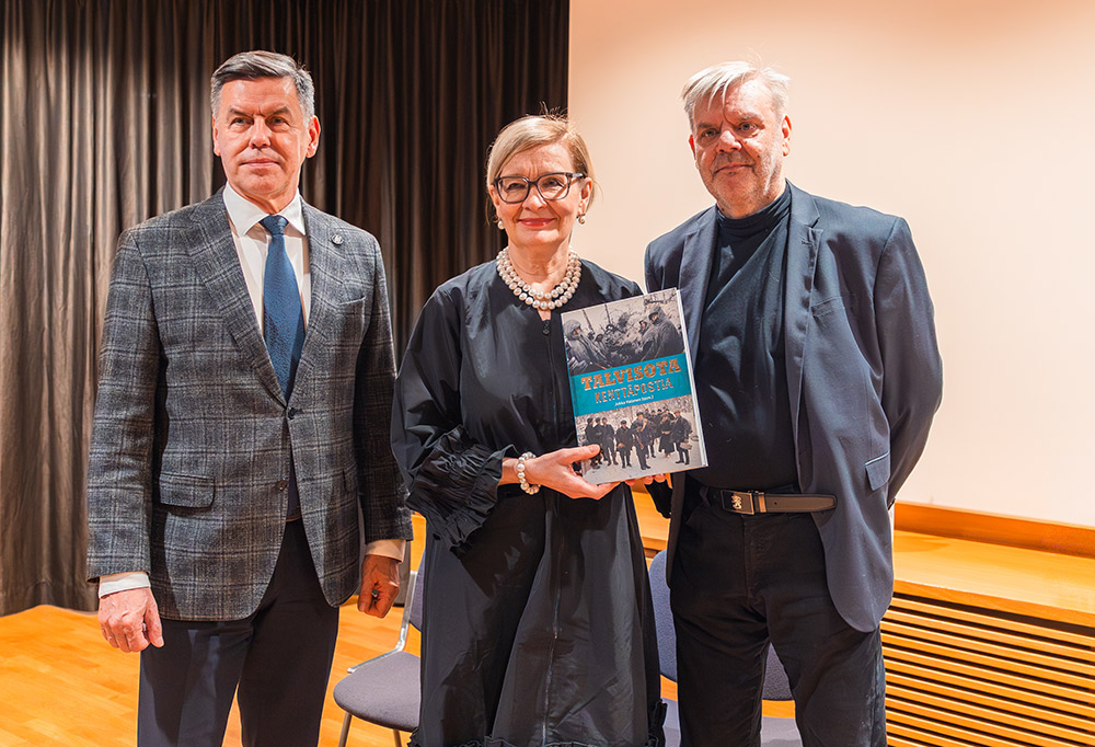 Kirja syntyi halusta vaalia veteraanien perintöä. Tammenlehvän perinneliiton toiminnanjohtaja Sakari Martimo (vas.) sekä tietokirjailija Jukka Halonen (oik.) luovuttivat kirjan eduskunnan puhemies Paula Risikolle (kok.) sen julkistustilaisuudessa. Kuva: Remu Shemeikka