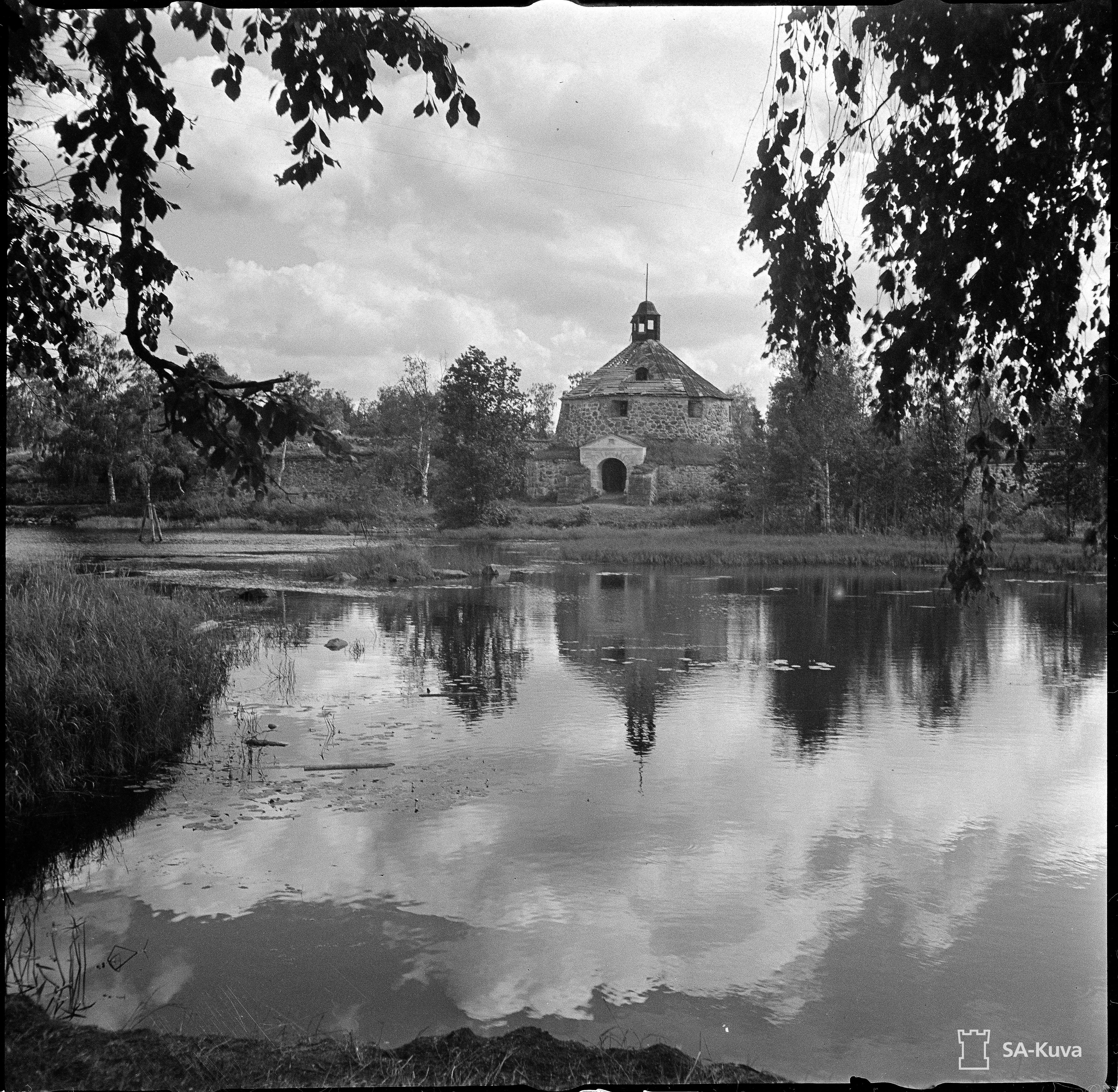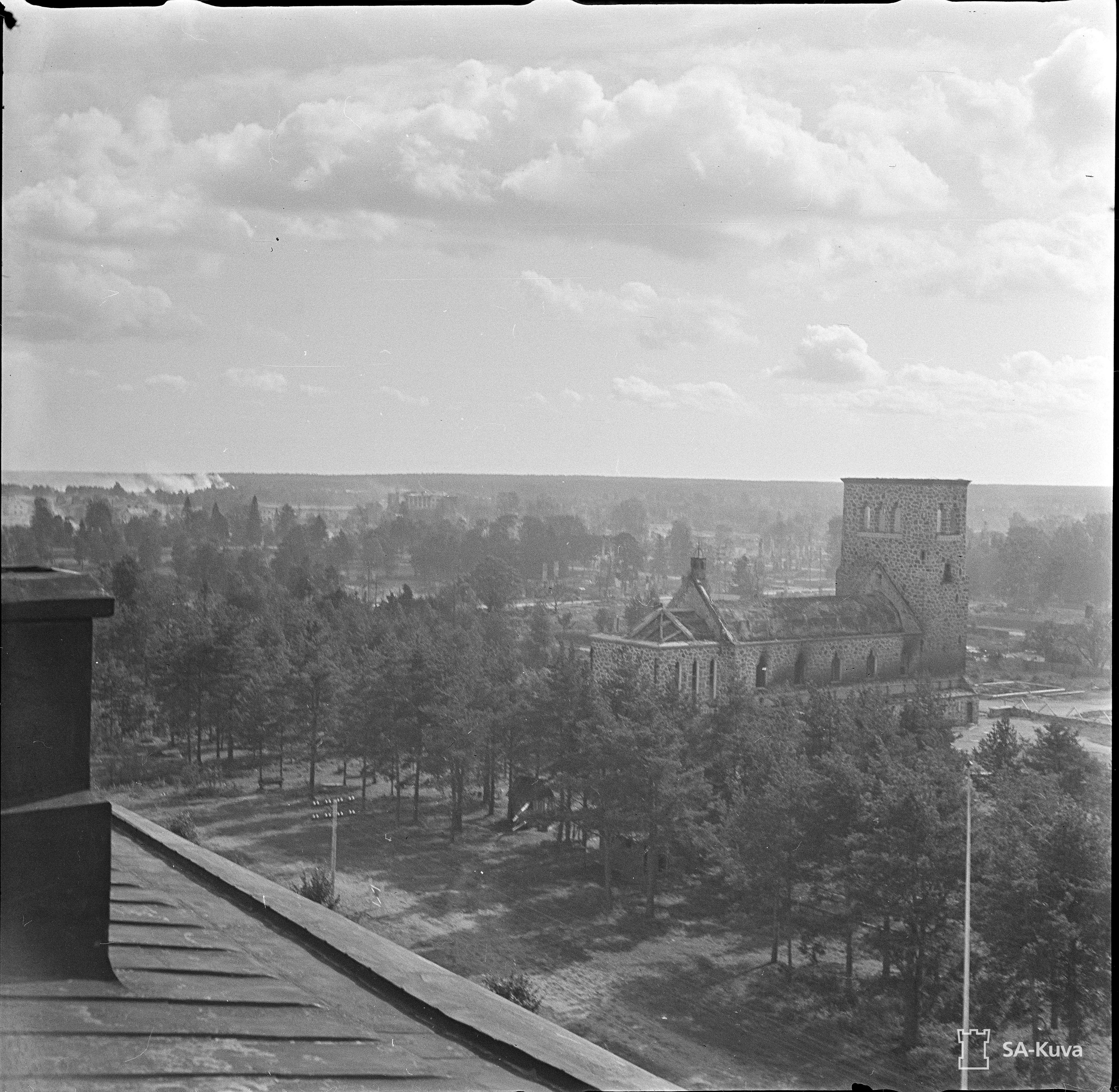 Käkisalmi kuvattuna Yhteiskoulun katolta kesällä 1941. Taustalla näkyy Armas Lindgrenin suunnittelema luterilainen kirkko.