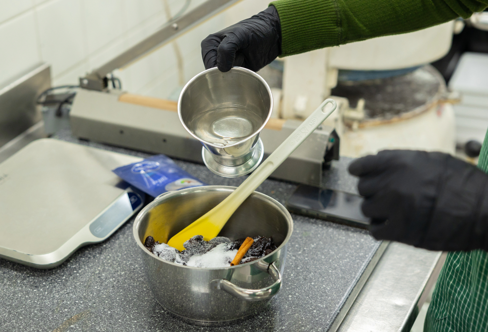 1: Mittaa sokeri ja vesi kattilaan, lisää luumut ja kanelitanko.
