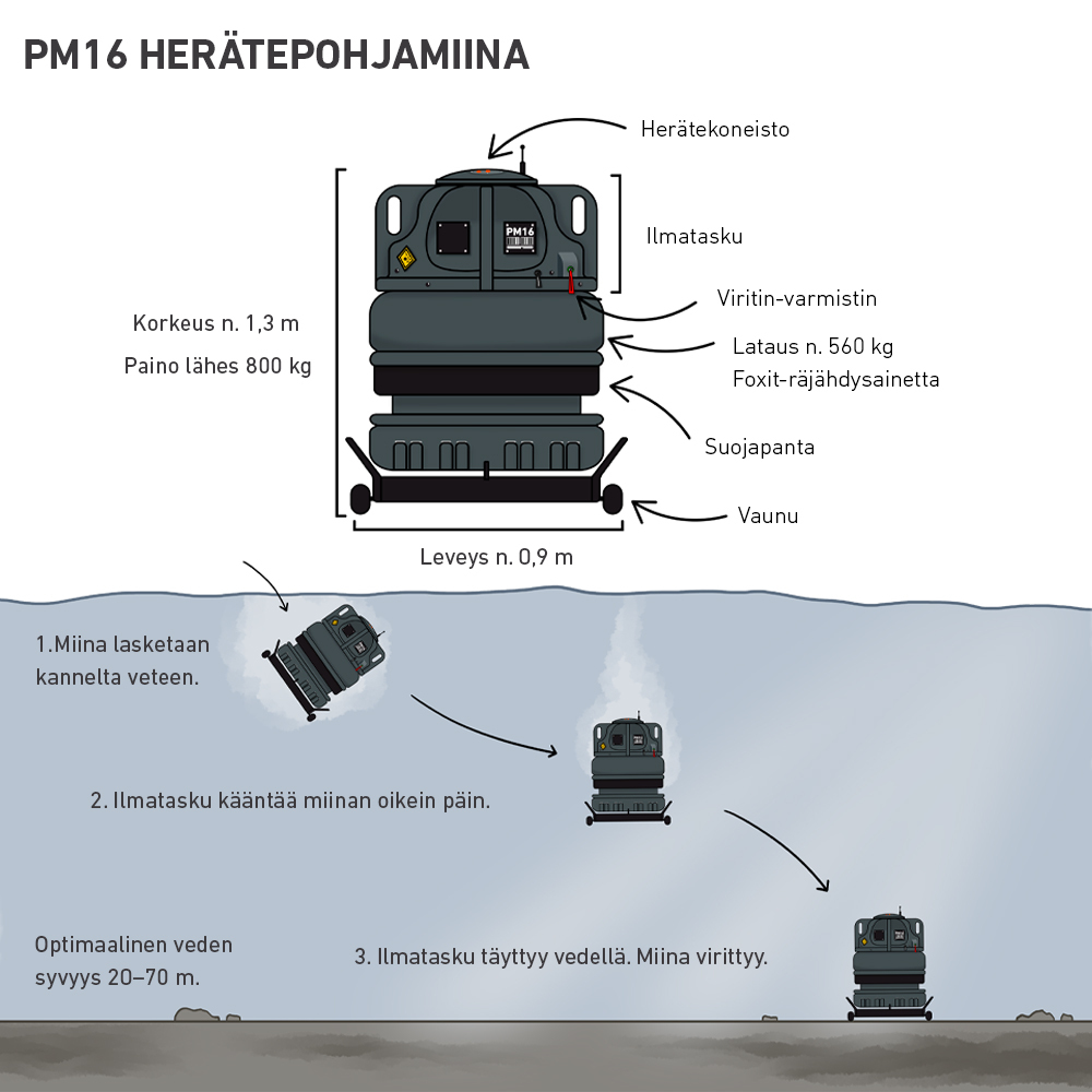 PM16:n voi ohjelmoida siten, että se räjähtää havaittuaan vain tietynlaisia aluksia. Kuva: Remu Shemeikka