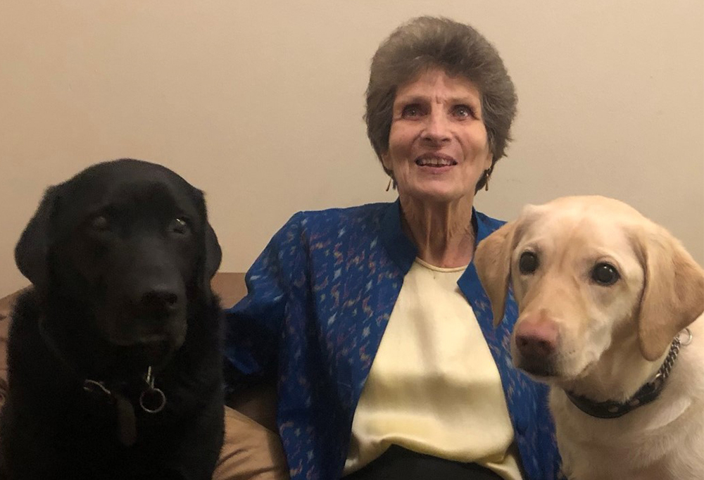 Maija Lindroos eläköityneen opaskoiransa Meten (vas.) ja nykyisen opaskoiransa Enjan kanssa. Kuva: Sonja Lindroos