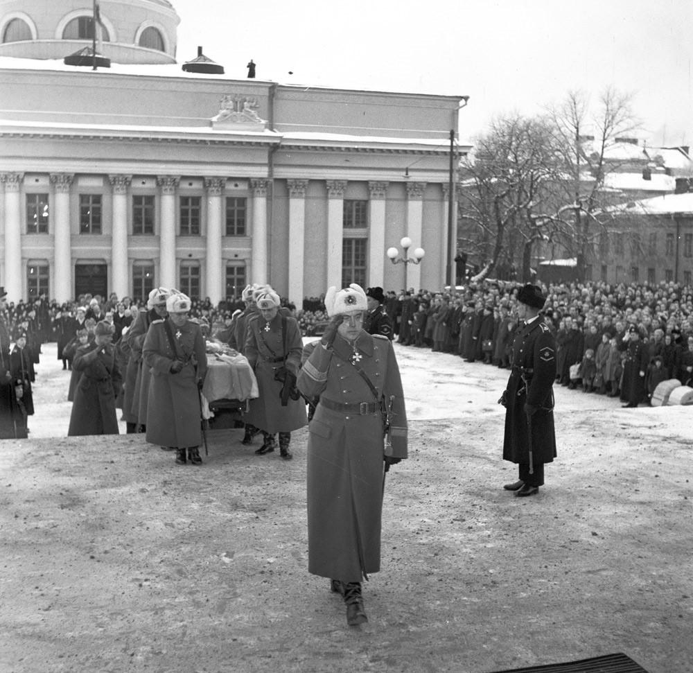 – Kallisarvoinen on perintönsä, jonka hän jättää vaalittavaksemme. Tämä perintö on isänmaan vapaus ja itsenäisyys – hänen oman elämänsä johtotähdet, totesi puhemies Fagerholm puheensa lopussa.