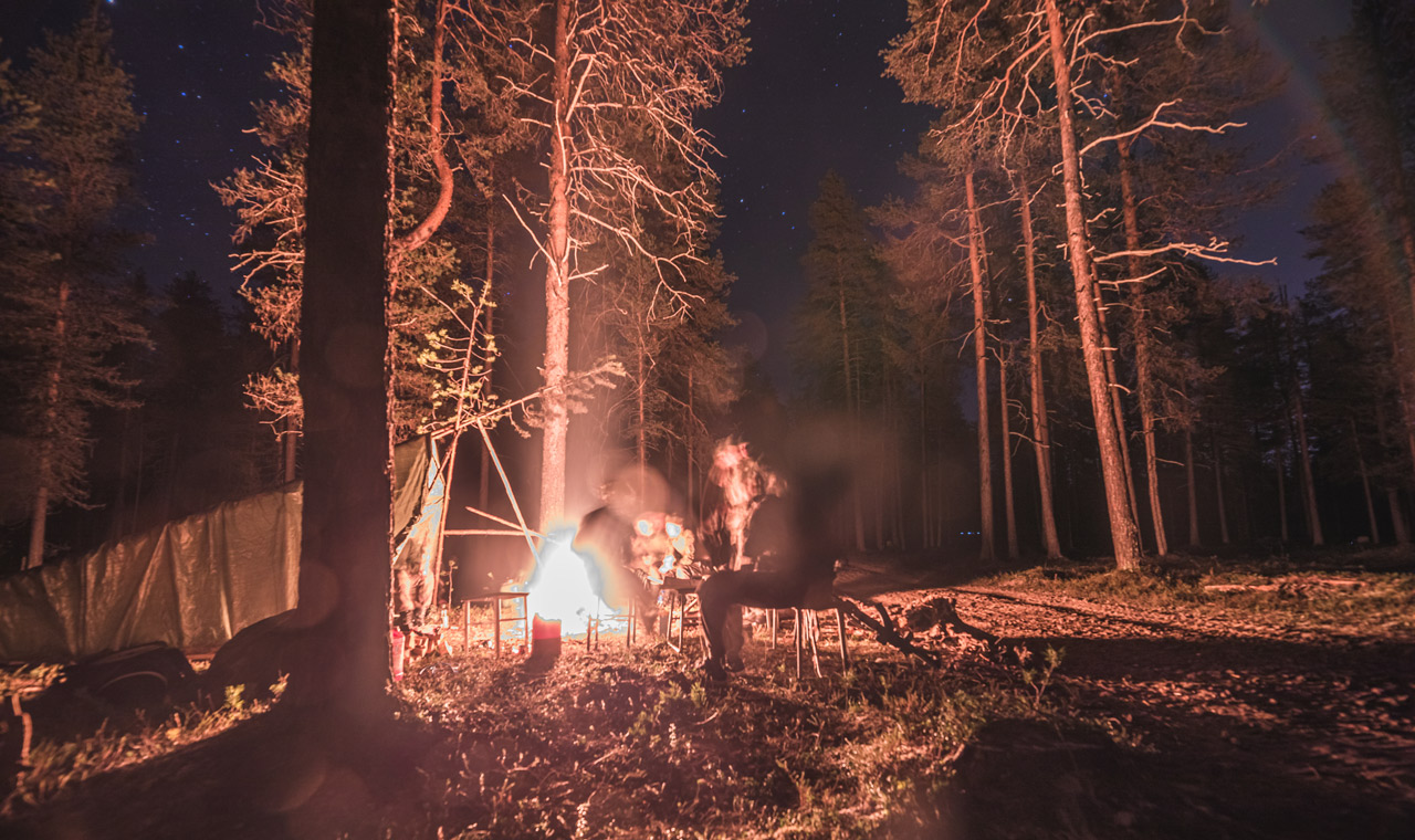 Onneksemme huomaamme metsän keskellä lämpimän tanssahtelevan valonpilkahduksen. Sen on pakko olla taukopaikan nuotio, sillä se ei näytä otsalampun valolta. Lähestyessämme huomaamme olevamme oikeassa. Kirkas nuotion loimu siintää pimeässä metsässä jo pitkän matkan päässä. Valo ja tieto lämpimistä tulenlieskoista tekee hyvää mielelle.