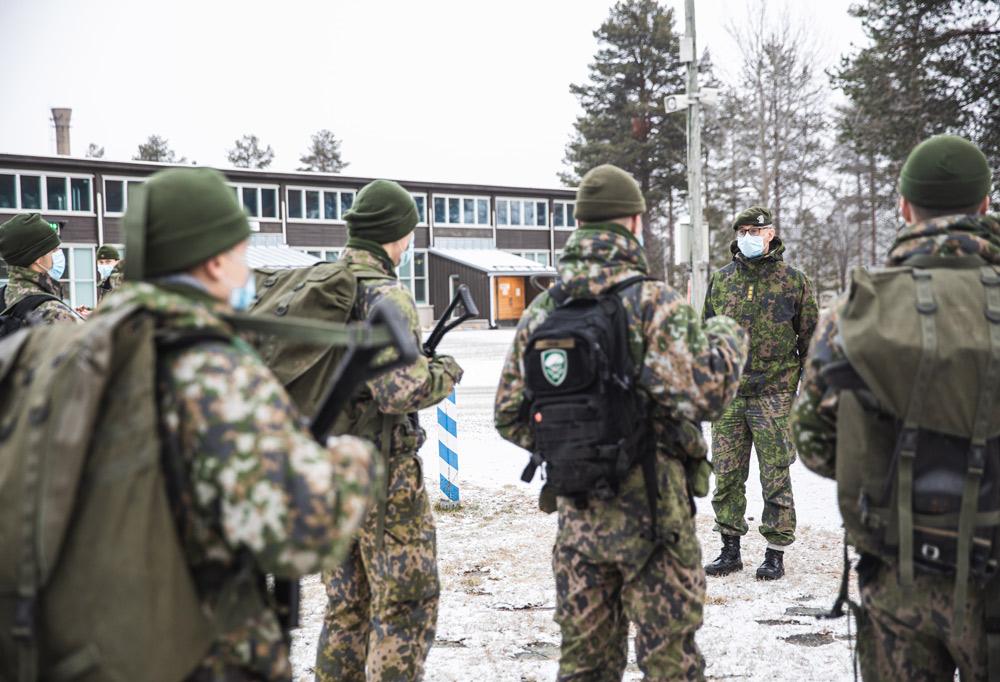 Kaikkien heitettyä ylimääräiset tavaransa pressulla päällystetylle huoltoalueelle oli aika siirtyä ulos marssivarustuksen kera. Noin sata varusmiestä ja henkilökunnan jäsentä seisoo jännittyneenä hiekkakentällä. Normaalista poiketen peittävät kasvomaskit kaikkien marssijoiden naamatauluja. Sodankylän verrattain paha koronatilanne on pakottanut Jääkäriprikaatin suhteellisen tiukkoihin toimenpiteisiin. Maskeja pidetään sisällä kaikkialla, ja näin tultaisiin tekemään myös marssin aikana.